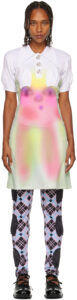 Noteworthy were the appliqués with elasticized trim adorning the chest and sleeves, amplifying the dress’s uniqueness. The silver-tone graphic hardware accentuated the futuristic essence of the outfit, while the vivid color scheme of the ‘Spray Paint Alien’ pattern unveiled a playful yet enigmatic narrative.
