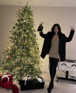 At the center of attention was the striking La Robe Fiesta Mini from Jacquemus—a sartorial masterpiece that, with its shimmery metallic mesh, embodied the glamorous spirit of NYE. The dress featured an alluring semi-backless design, adding a flirtatious charm to Jennie’s ensemble, which she confidently flaunted to her followers with a cheeky pout. To ward off the winter chill, Jennie paired the mini with a black trench coat and sleek leggings. In addition to keeping her insulated, they provided visual contrast with the dazzling dress, creating a dynamic look.