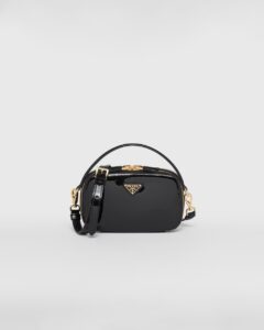 In the sleek milk white satin top, Sana exuded elegance with its mock neck and iconic enamelled metal triangle logo. Paired flawlessly, the Odette Mini-Bag in patent leather added sophistication, carried effortlessly by Sana, showcasing its structured design and luxurious Nappa leather interior.