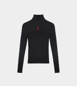 The Shushu/Tong Mock Neck Sweater, a creation that epitomizes sophistication and comfort, became the centerpiece of Yuna’s ensemble. Crafted from a luxurious ribbed wool blend, this sweater exudes refined simplicity with its basic design, elevated by the subtle yet distinctive Shushu/Tong Logo embroidered in red thread just below the neckline.